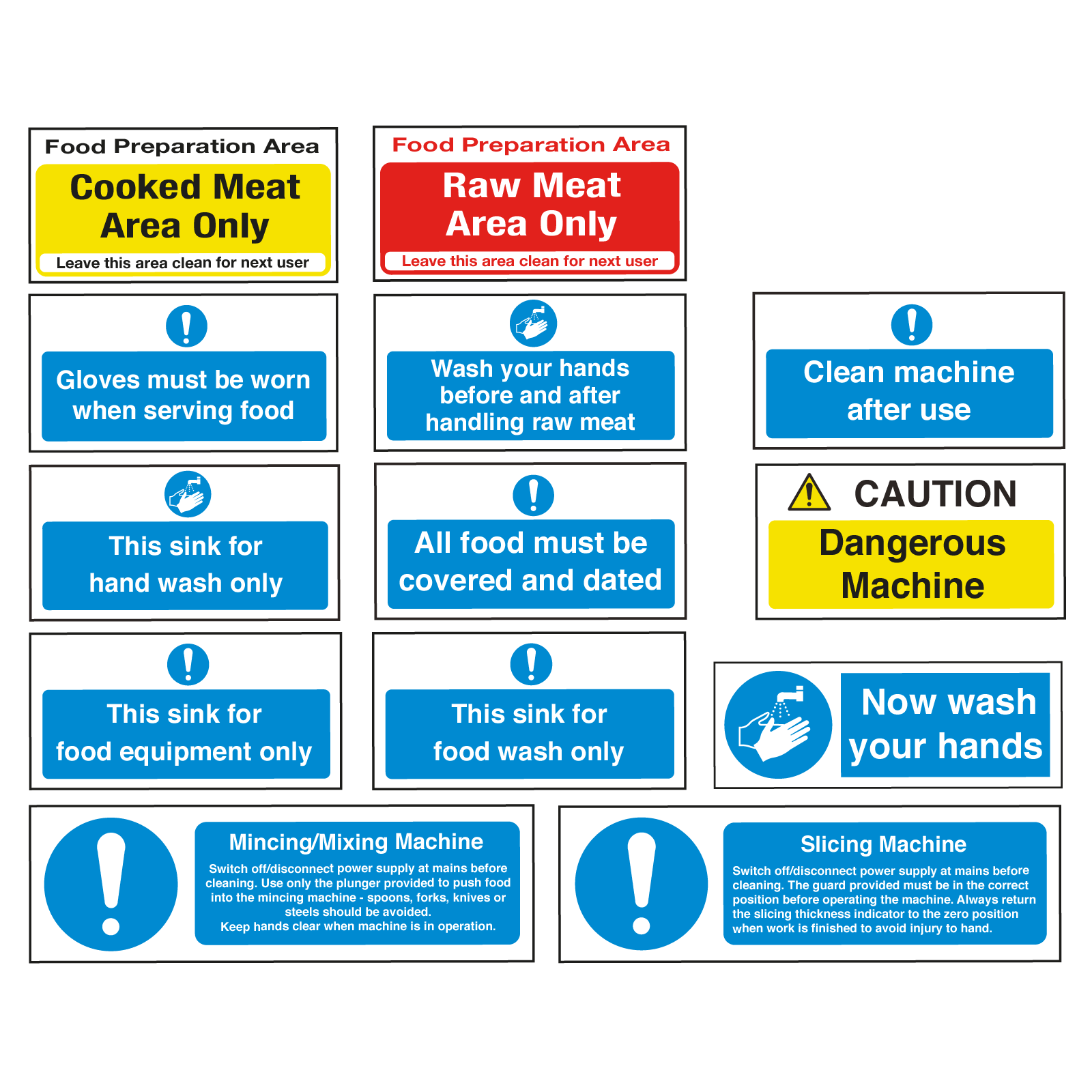 This sign pack is Ideal for Food preparation area's, food storage & delivery and machine safety. All self-adhesive vinyl notices can be applied to Fridges, freezers, doors, tiles and most kitchen surfaces. Easy to wipe clean with a damp cloth.