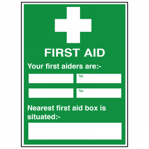 Appropriately display this sign to inform the reader of anyone qualified in first aid during the case of an accident or emergency as well as their nearest first aid box.