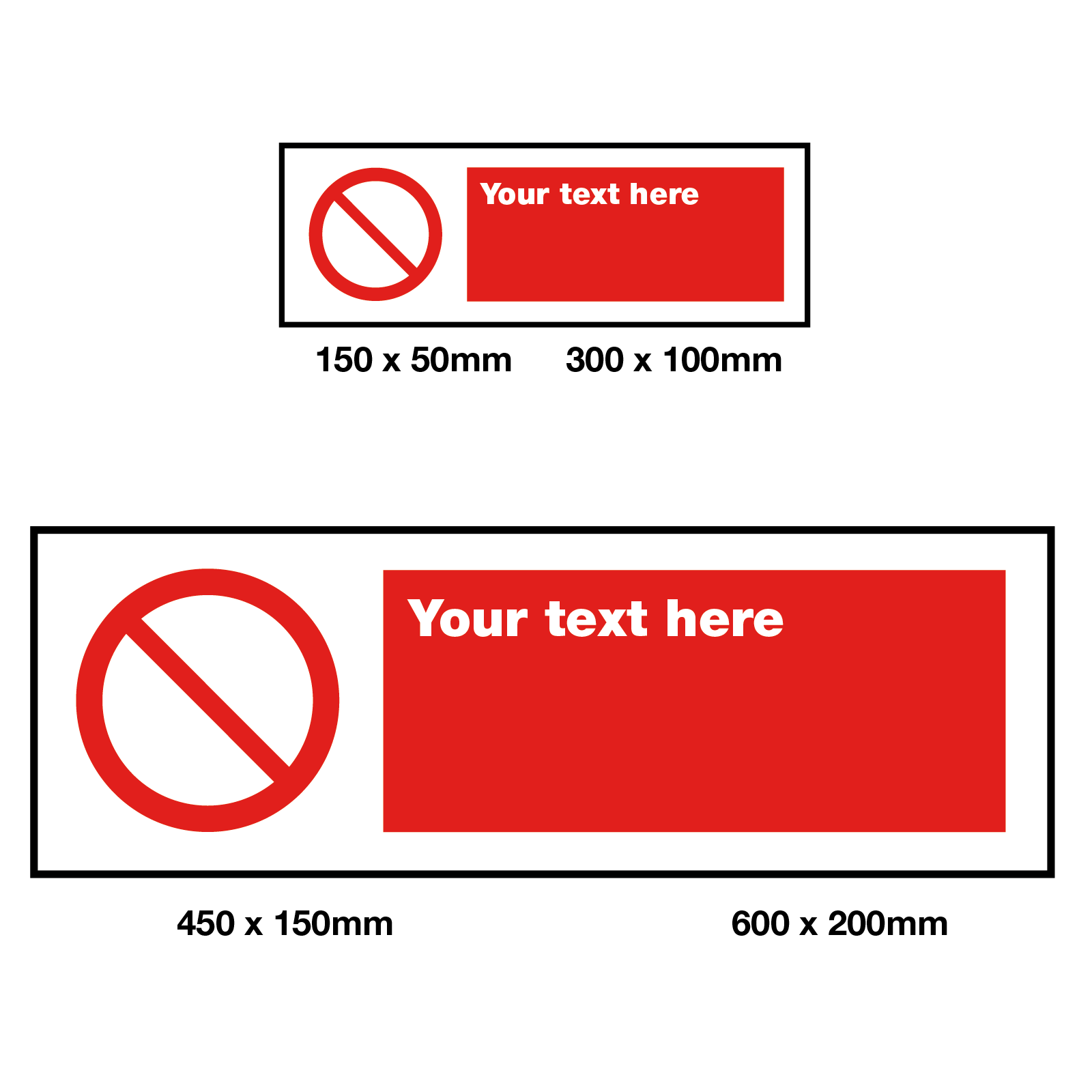 Create you own Prohibition safety sign with a message and symbol that fits more appropriately to your workplace. By ensuring that the appropriate message is displayed, it can reduce the risk of any accidents or injuries within your workplace. Prohibition signs state actions that must NOT be taken.