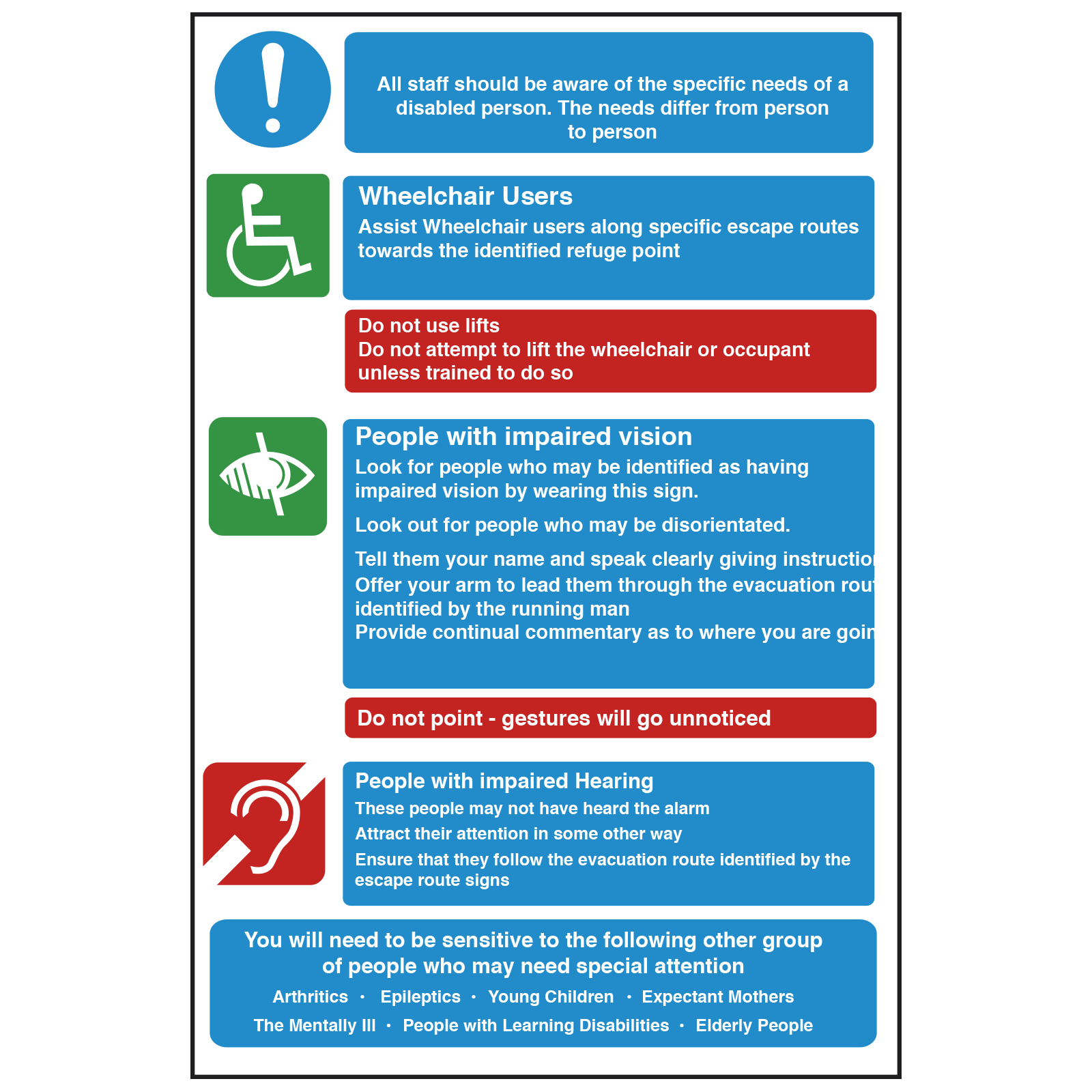 This fire action safety sign informs the reader on how to assist physically impaired and disabled people during an emergency.