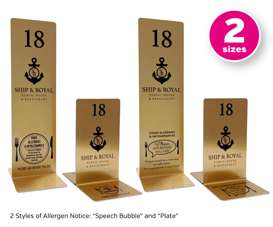 These table numbers are ideal to remind all customers to ask servers and waiting staff about ingredients in meals before they place their orders if they have any allergies. This helps to reduce the risk of allergen cross contamination.