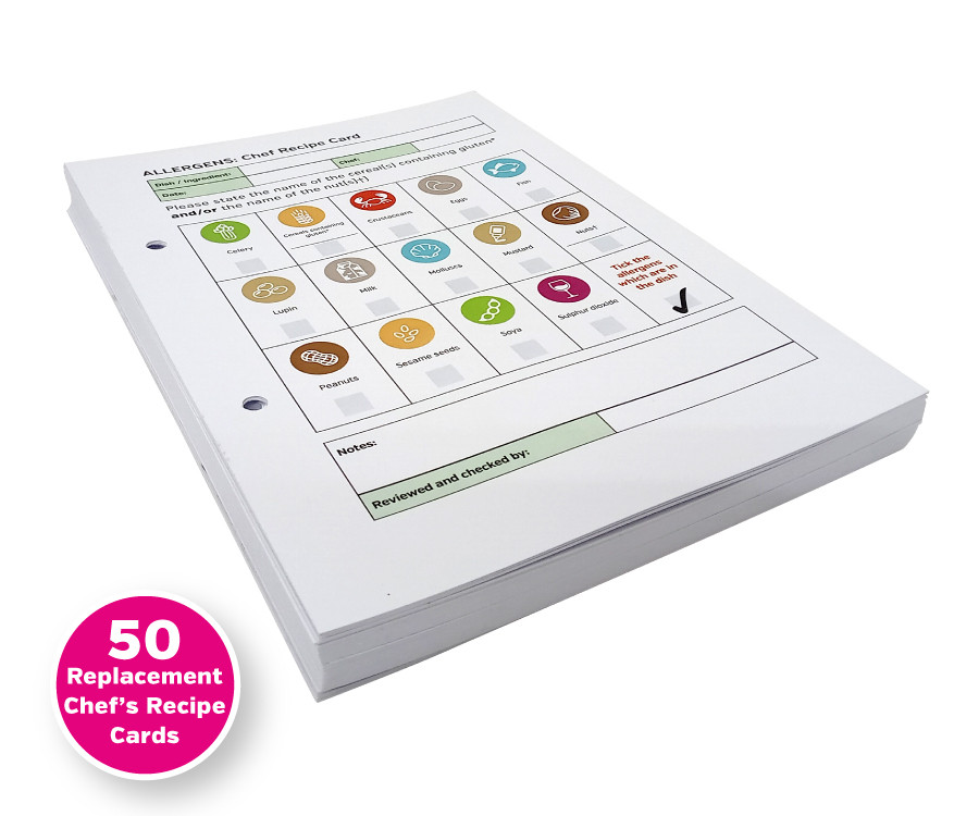 Chef Dishes - Staff & Server Allergy Card Guide - A5 Ring Binder with 50 Chef Recipe Cards (Double sided to allow fill in 100 dishes)