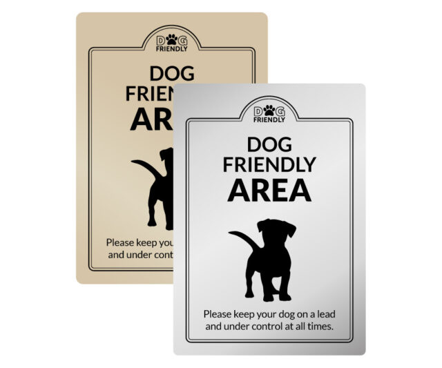 Displaying the ‘Dog Friendly Area’ notice in specific parts of your establishment informs responsible dog owners and walkers that their furry friend is welcome in that allocated area. They must ensure their dog is kept on a lead and under control at all times.