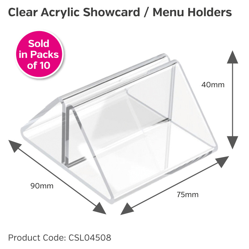 Our clear acrylic menu holders (also known as Q-Clips) are an easy way to display menus and promotional inserts on a countertop, bar, or table, each menu holder is made from a high-quality 2mm thick clear acrylic and can support inserts up to 2mm thick.